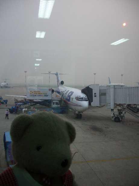 通路のガラス越しに、今ボクが乗ってきた飛行機が見えたくまよっ♪♪♪