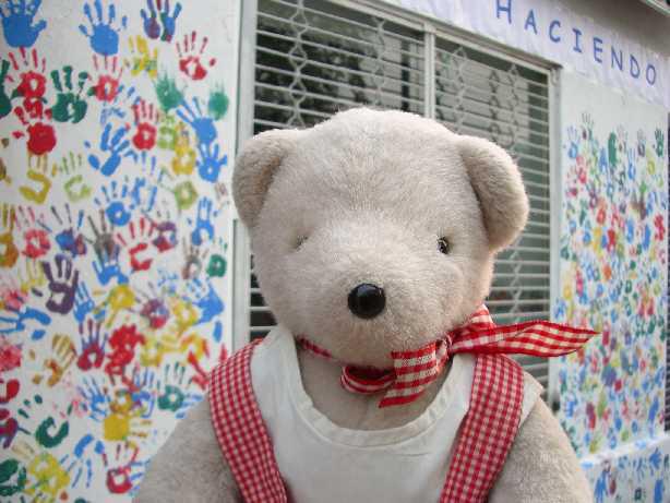 そしたら、何のお店かはわからねかったくまけど、可愛い子どもたちの手形がたくさんペイントされた壁を発見したくまっ!o(^- ^)o