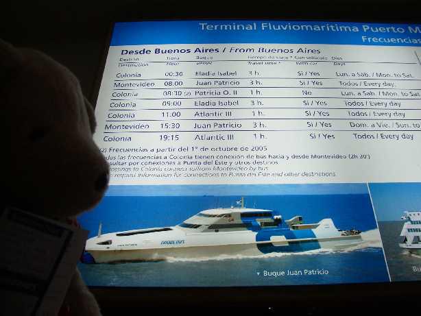 ボクが乗るフェリーは、一番下に書いてるので、モンテビデオに直行するのじゃねく、コロニアって町に着くのくまよっ♪