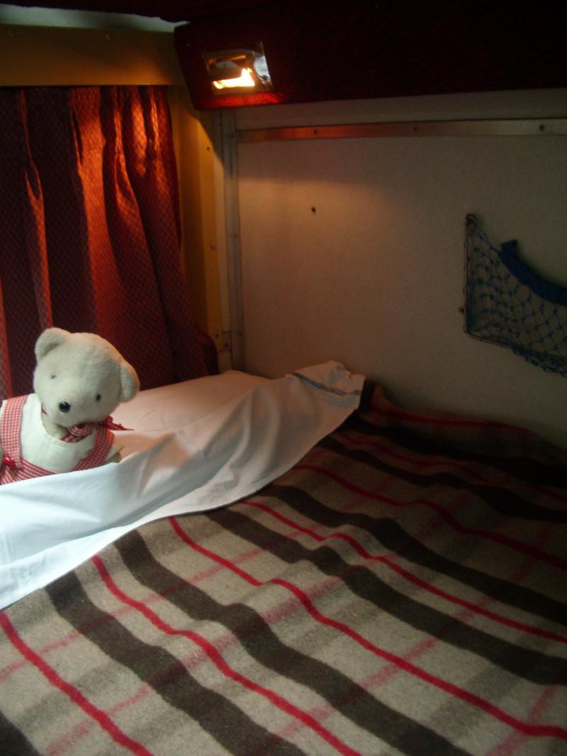 お部屋に入った時はシートの状態だったけど、駅を出てしばらくすると、ベッドメイキングしてくれるオジさんが来て、アッという間にシートをベッドにしてくれたくまよ☆
