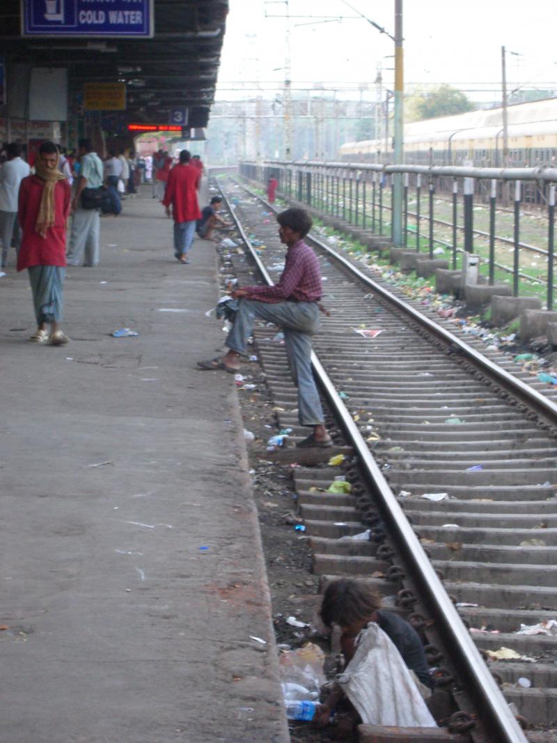 ▼線路でゴミを拾う人たち…。