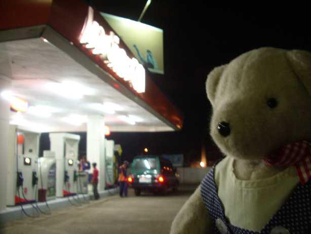 タクシーは、空港を出発してすぐに、ガソリンスタンドさ寄ったくまよ。