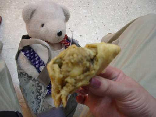 ベンチに座って、サモサを食べたくまよっ♪