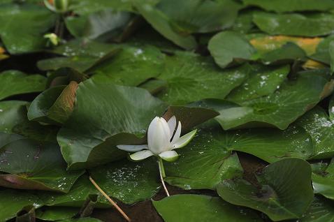 池には「スイレン」の白い花が見ごろ。庭の管理人の話によると