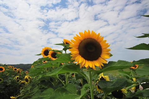 大きな姿のひまわり。秋の空を背景に毅然と立つ。