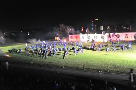 かがり火が炊かれ、甲冑姿の武将たちの合戦シーン。