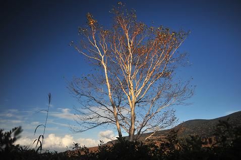 紅葉の葉が、残り少ない白樺の樹。青空に幻想的な姿。