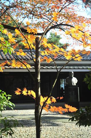 ▼斎藤茂吉の銅像(紅葉に囲まれて)