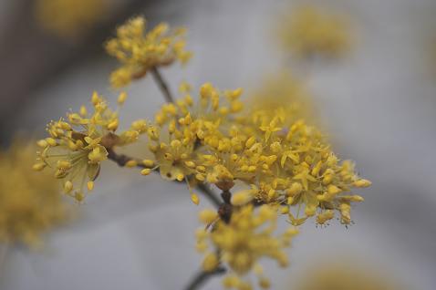 サンシュウの花は、早春に葉に先立って黄色の小花をつけ、春の到来をいち早く知らせる花の一つ。芽吹いていない周囲の中でひときわ明るく見える。最近、町の中で見かける新社会人となって旅たつ若者のようだ。