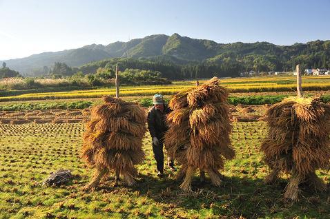 黄金色の稲穂を天日干しする、稲杭作業は皆無に近い。農家の働き手の高齢化により、コンバインによる収穫風景が良く見られるが。天日干しの稲杭は貴重な風景。
