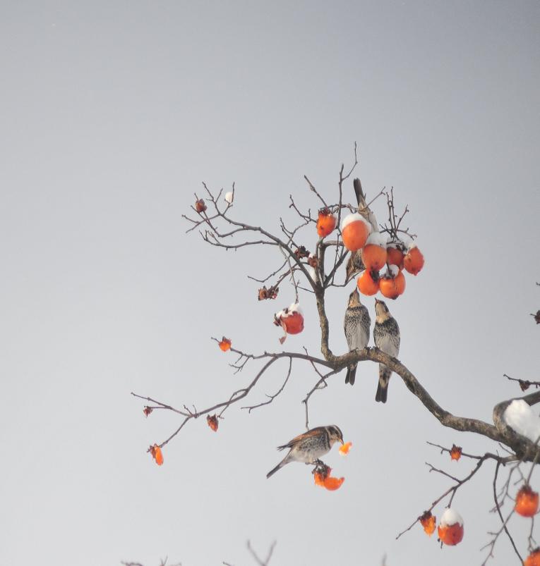 仲良く並んで囁きながら朝食中。食べきれないほど沢山の美味しく熟した柿。