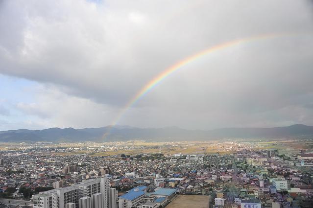 先日、山形駅の近くのホテルに宿泊し、虹が出そうな空模様なので急ぎ霞城セントラルの展望室に行き。暫し待つと大きな「レインボー」が出現した。窓越しなので半分しか撮れなかったが素敵な虹に感動した。