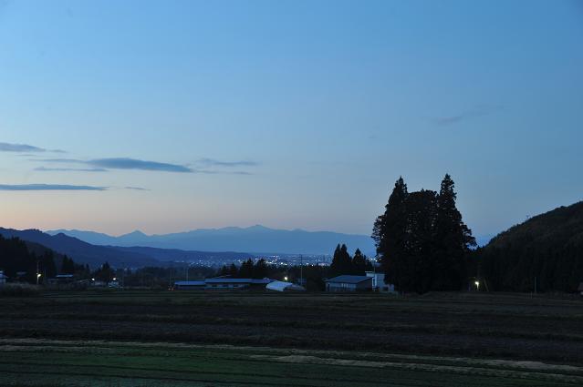 晩秋のトトロの森、快晴のせいかスッキリと全体を眺めることができた。働いている方の話によると「このような天気は滅多に眺めることが出来ない」と話してくれた。日没後の風景の静寂こと米沢市のネオンがチラホラ輝きだしている。遠くには祝瓶山(左手)・朝日岳(中央)雄大な姿を見せている。次回は真っ白い山に夕日で赤く染まった風景を撮りたい。