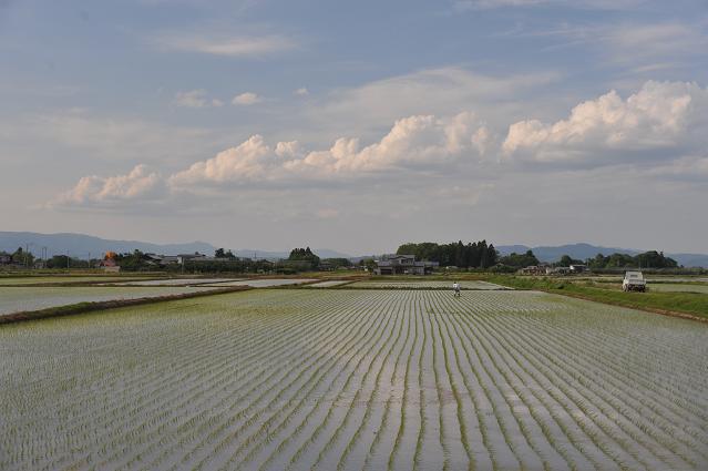 通いなれた農道で、素晴らしい作業風景を見る。田植機械も6列植えが主流だった。しかし、今年は8列の田植機械をみることができた。300万円位すると作業している方に聞く。作業能率がアップし、手伝いする人は一人から3人必要との事。ある、快晴の天気。田植後3週間くらい経過の田園風景。稲は完全に根付き青々としてきた。作業の成果は上々。