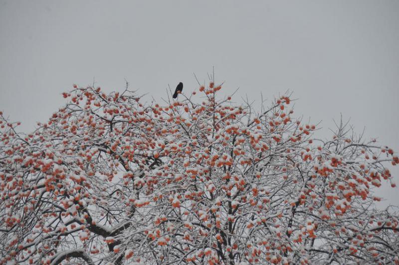 米沢に冬到来。大きな柿の木に烏が飛来し、辺りを監視しているのでしょうか?それとも、仲間が来るのを待っているのでしょうか?柿はまだ熟していないので下見して間もなく美味しく食べられと仲間に知らせるのかな。美味しく熟した頃には沢山の野鳥で賑わうことでしょう。