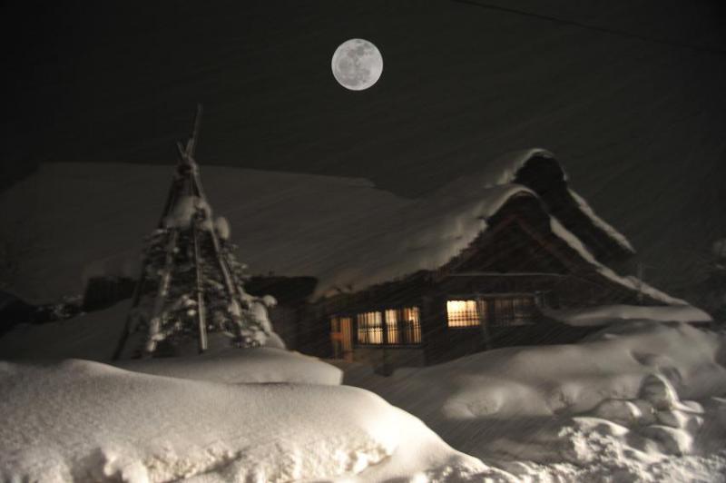 雪国の夜の明かり。雪下ろしをして疲れた身体を癒し風呂に入って、いろりを囲んで夕食団欒の時を持っているのでしょう。「おばあちゃん鍋料理美味しいね!身体がしんから温まるし、このお刺身は大好物のびんちょうまぐろ」だね。そうだよ、沢山食べて元気を出して明日も働いてね。満月の明かりと古民家の明かりが暖かい雰囲気をかもし出している平和な家庭のようだ。