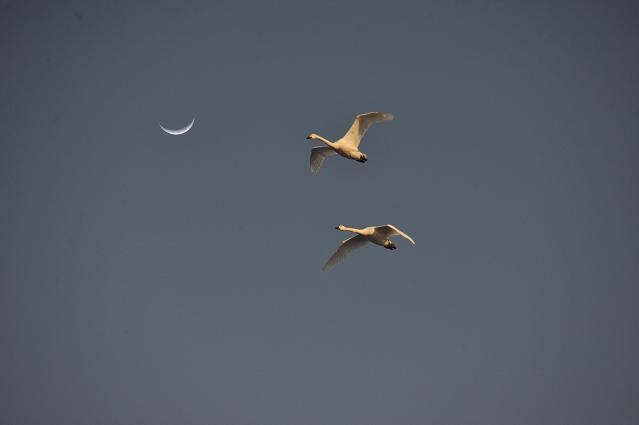 ある晴れた日の夕方、窪田の白鳥飛来地へ白鳥に逢いに行く。北に帰ったのか70羽程と、朝の調べで記録されていた。どれくらい窪田の白鳥飛来地に戻るのか心配していると、突然北のほうから飛来してきた。白鳥には、宇宙と同じで国境もないし自由うに飛べるよさがある。うらやましい!