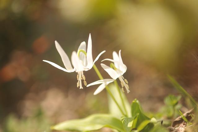 例年より遅れて咲いたカタクリの花。珍しい白色のカタクリの花が、一週間遅れて咲いた。二株が揃って咲いた。二十数年前に友人にいただいた一株の種から、増えたのでしょう。かれんな姿を見せてくれる。