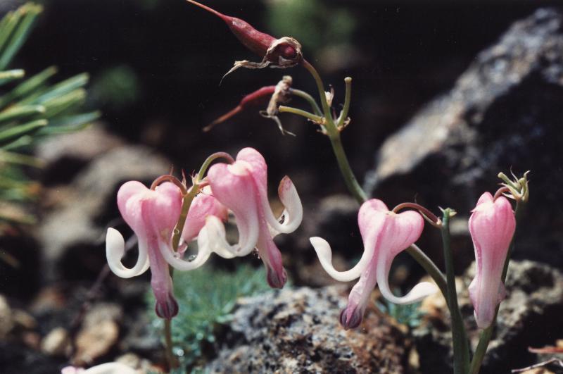 蔵王山の熊野岳付近に咲く「こまくさ」。好天に恵まれ撮ることができた。ピンクのハート型の花はきれい。赤ナンバンの様に見えるのが種子が入っているさや。