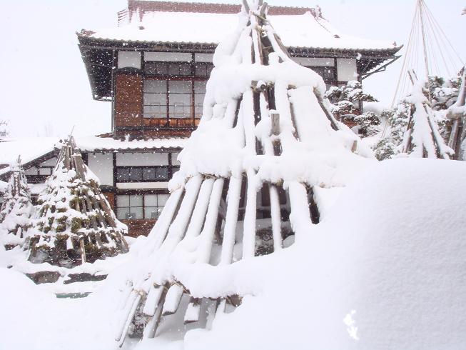 雪が消えて雪囲いの姿がはっきりしていたのに。なごり雪ですっかり冬に逆戻り。