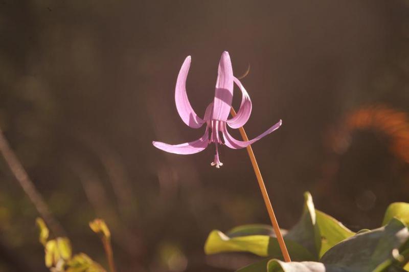 私が「かたくりの花」の写真を撮っていると同年輩の方が一人昇ってきた。目当ては山菜採りのようで腰に籠を巻いていた。かたくりの花は夕日に照らされてとても綺麗にスポットライトを受けて輝いていた。自宅の庭に咲くかたくりとは比べられない姿をていしていた。帰り道、若いカップルが息を切らして昇ってきた。「かたくりの場所はまだですか」と訪ねたので「もう少しですよ」励まし、わたしは家路に急ぐ。