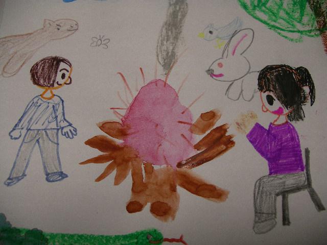 うさぎ、鳥、ちょうちょ、へびなどと一緒にたき火。