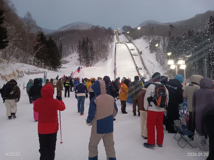 女子スキージャンプワールドカップ蔵王大会20日、山形市の蔵王ジャンプ台で開幕、 2試合行われるワールドカップ個人戦の初日に行ってきました、世界のトップジャンパー見ようといざ蔵王へ・・ 前日は強風の影響で予選が中止となり、本戦も予定よりも2時間遅れの午後6時20分から始まりました。地吹雪が舞うなか待つのも寒くて大変でしたね・・・今住んでる米沢市窪田地区にはスキージャンパーの高梨沙羅選手を応援する会があります、沙羅選手の祖父、祖母は山形県米沢市と高畠町出身ということで山形はなじみがあり、玉コン、芋煮も大好きという・・試合では丸山希選手の1本目。ただひとり100メートルを超える大ジャンプを見せトップに、そして高梨選手は1本目79mだったか?、2本目は、挽回出来て良かった、そして2本目最後に登場した丸山希選手は92.5メートルを飛び、蔵王大会初優勝、もうすぐ始まるオリンピックでのメダルに期待が高まりますよね・沙羅ちゃん他日本勢頑張ってほしいですね・・しかし、しかし、ほんとに寒くて歳よりにはきつい!・・足踏みしながら、腕組んで「押し競饅頭」しながら耐えました・・