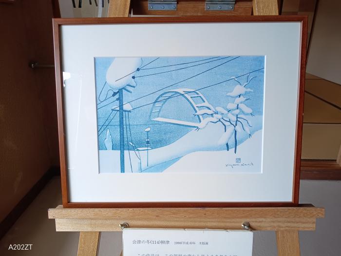 先月11月5,6日と西会津方面に旅行、会津西山温泉の”旅館中の湯”さんへ泊って帰りに斎藤清美術館によりまして、そこからすぐの只見川の土手・・そこには只見川に赤い橋が映える、額が立てかけてありそこから望む風景がなんともいい感じですね、福島県河沼郡会津坂下町出身の木版画家『斎藤清』はこの橋を作品に残している、清氏は独学で独自の木版画技法を確立したことが有名で、なおかつ浮世絵版画の技法や西洋作家の近代的造形を積極的に取り入れ、独自の日本的感情を表現したことが高く評価されてます・・晩年移住して多くの作品を残している、写真2枚目の柳津橋・・従来の柳津町中心部を通るルートを避けるために新たにバイパスとして建設された国道252号の橋である。近傍に日本三大虚空蔵尊の一つとして名高い福満虚空蔵尊その門前町が広がる景勝地でもある、金属アーチ補剛桁部分が赤く塗装され、只見川の流れや周囲の山々の緑色に映え大変美しい景観見せる、清氏の作品は自宅アトリエから見た橋となっている・・
