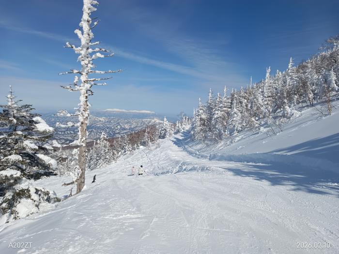2月10日(火)天元台高原、久しぶりの快晴です・・第三リフト降り場(1820m)北望台から蔵王連峰を望む、他に飯豊、朝日、湯殿山・姥が岳・月山に鳥海山まで良く見えました・針葉樹林帯の木々は樹氷となってますね・・コン日なら西吾妻のスノーモンスターめぐる登山も良いけどもね