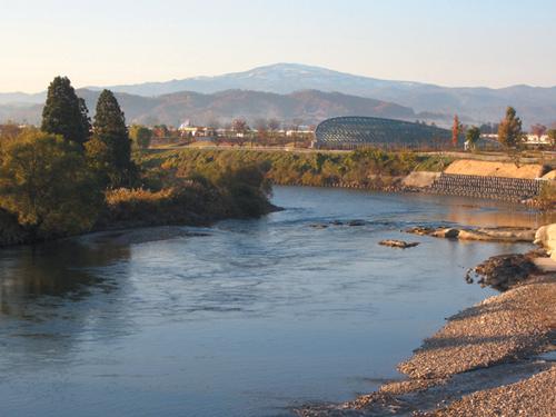 ふと足を止めてまわりの景色をみたくなる、そんな気持ちにさせられる高瀬大橋からの眺め。晴れた日には川の上流に月山が見える。眼下には生前とした田んぼが広がる。心を落ち着かせてくれるそんな風景がここにある。