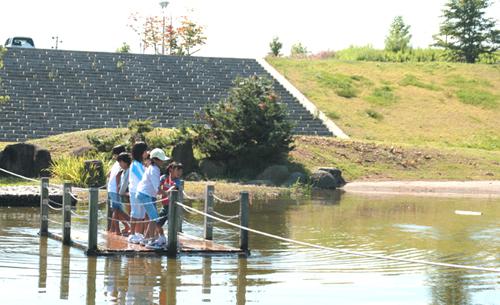 最上川に架かる長崎大橋のすぐ下にある高水敷に「長崎せせらぎ公園」がある。最上川の源流から河口までの姿をモデルにして配されたこの公園には、川の流れを利用した無動力ポンプで最上川から水が流され、園内の施設に送られている・全国初の川と一体になった公園だ。休日には多くの人たちで賑わう。