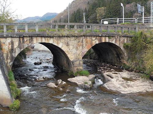 上山市内には他にも石橋が3つあるが、河床中央の橋脚から左右の川岸にまたがる2連のアーチを持った眼鏡橋はここだけ。