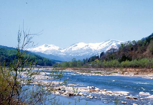 雄大な景色が広がる。寒河江川と遠くには湯殿山、姥ヶ岳、月山が望める。