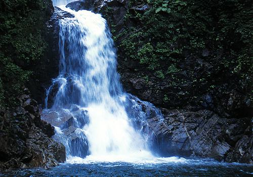 白布温泉街脇の大樽川にかかる。初夏は西吾妻山の雪解け水で水量を増し豪快。滝壺まで歩ける。