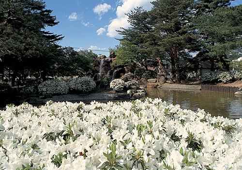 樹齢750年の古樹や3000株のつつじが、5月中旬には純白の花をつける。園内にはせせらぎも流れいこいの場となっています。