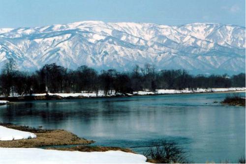 最上川が長井市域に入流してから約3キロメートル。愛宕山を対岸にした長井市豊田地区河井で、左岸から置賜白川が合流する。飯豊連峰の水源から発した置賜白川の流れは、ここで最上川と一つになる。