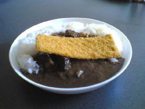 3合のご飯を圧縮し、ビーフカレーをかけ、ビッグかつを乗せてできあがり。