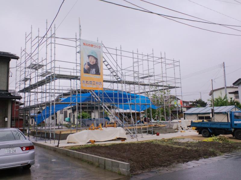 S様邸今日は土台の敷き込みを行っております。現場の上だけは青空(ブルーシート養生)の中で作業しています。いくら水に強い檜(ひのき)の土台でも雨に濡らしたくありませんので朝一番で養生をしました。明日天気にな〜れ!