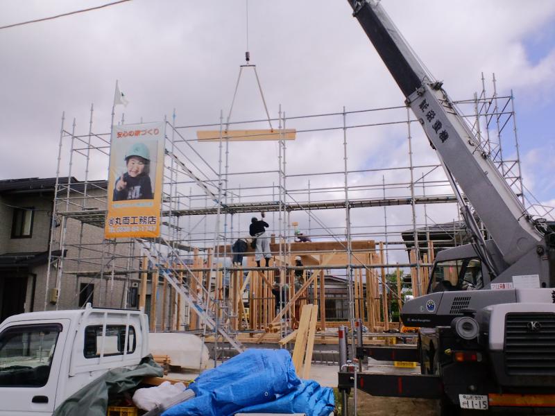 S様邸今日は建て方を行っています。木組みをする時に欠かせない ”カケヤ”という道具があります。簡単にいうと、大きい金槌の木のバージョンの物です。心地よく”カケヤ”の音が”トントン”と現場から響き渡っています。