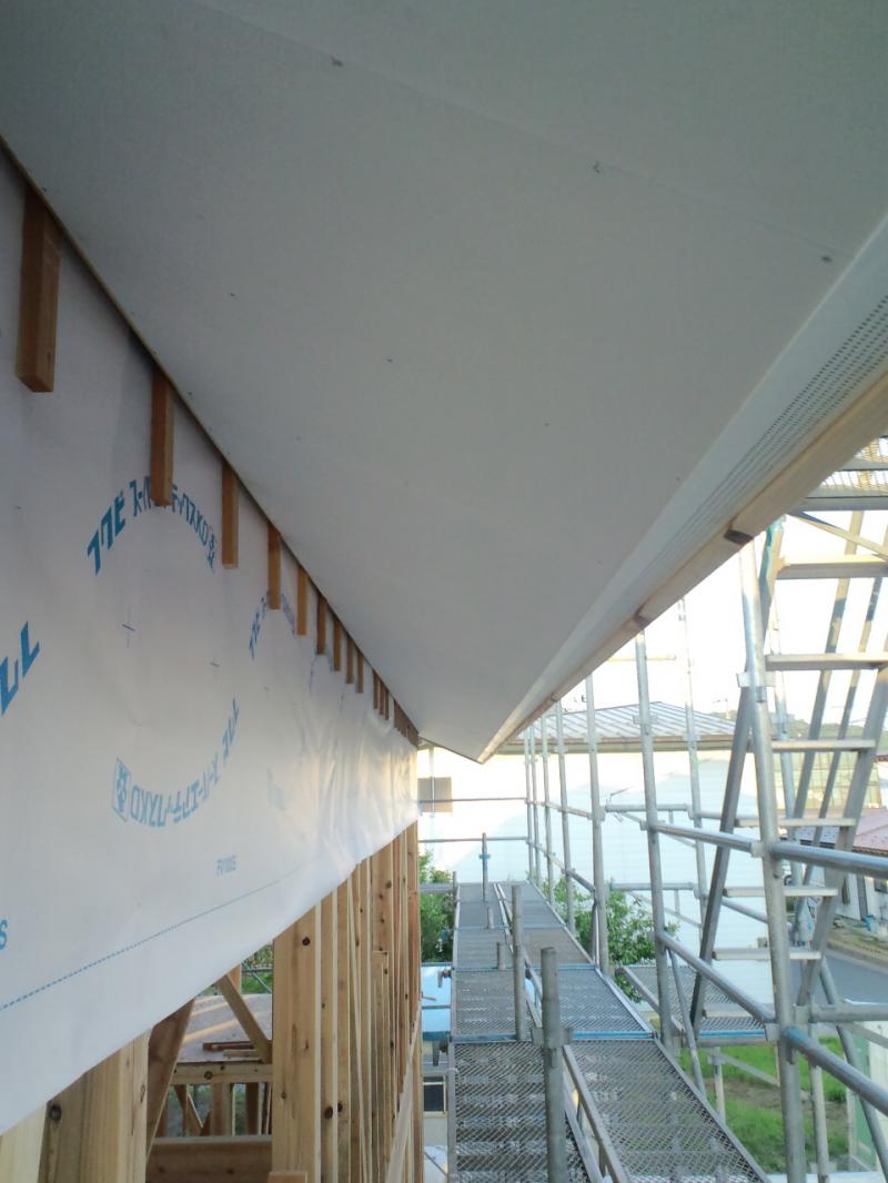 S様邸外部屋根の下、軒下部分の天井工事が半分終了しました。屋根部分に使用した木材が呼吸できるように、軒先換気口、棟換気を使用しています。