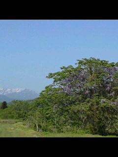 小野川温泉街 周辺の 散歩道からは 高い山に 残る残雪と 満開の フジの花が キレイです。