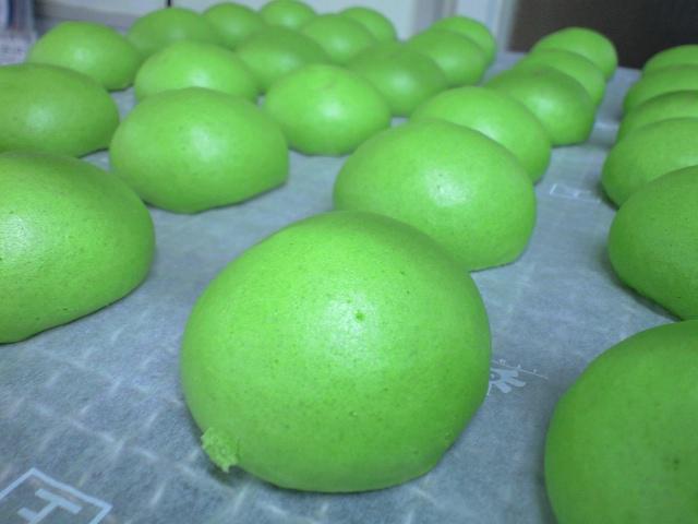 生地に 抹茶を 練り込み、小豆のこし餡を 包んでおります。