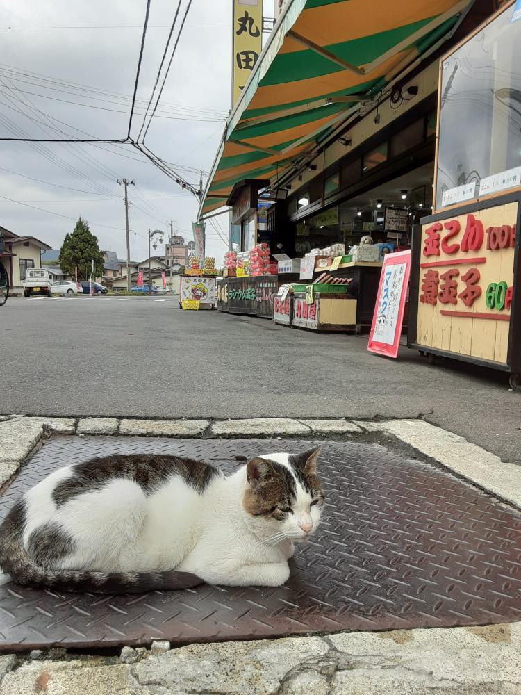 地域ねこの「みみたろう」寒いので、温泉のお湯が 通っている鉄板の上で、温まっています。