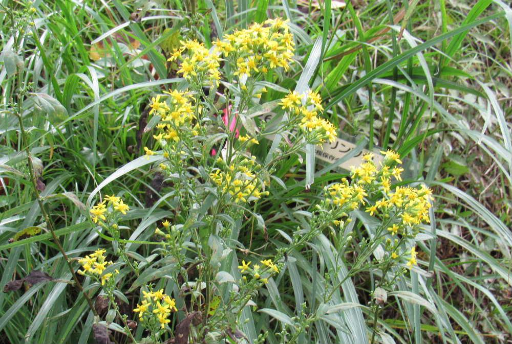総状お黄色い花をたくさんつけている「アキノキリンソウ」 烏帽子山公園の観察会で紹介していただきました かつては里山に囲まれた水田の周辺 ため池の土手などにごく普通に見られた秋草の代表であり リンドウ等と共に小学校の教科書や絵本などでよく紹介されていた草花です しかしそのような環境の減少や荒廃と共に見られる場所が少なくなり「秋の道ばたの黄色い花」はセイタカアワダチソウに取って代わられた感があります 和名のキリンソウは黄色の花が多数集まて咲くことから「黄輪草」と名付けられその後「麒麟草」となったという説もあります