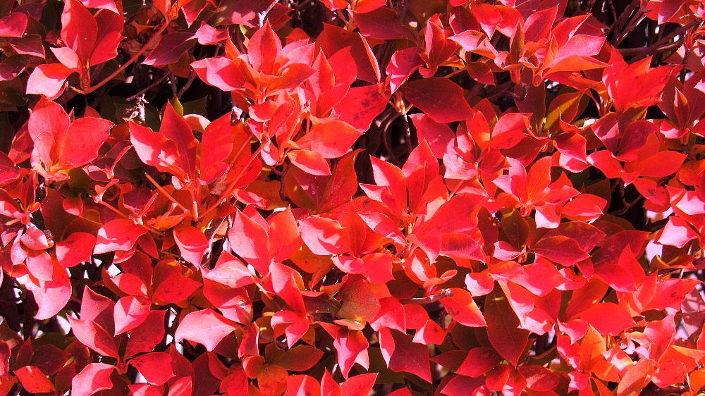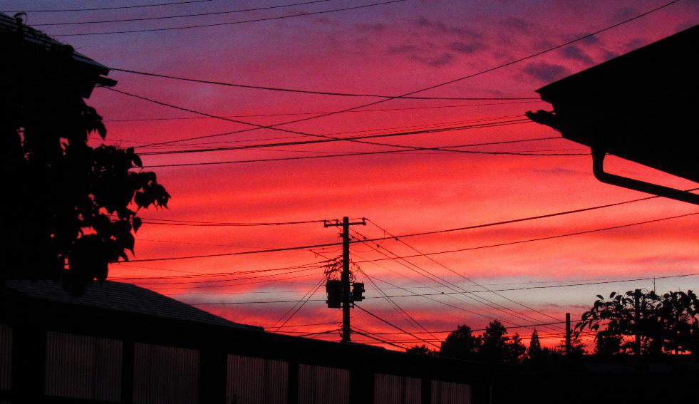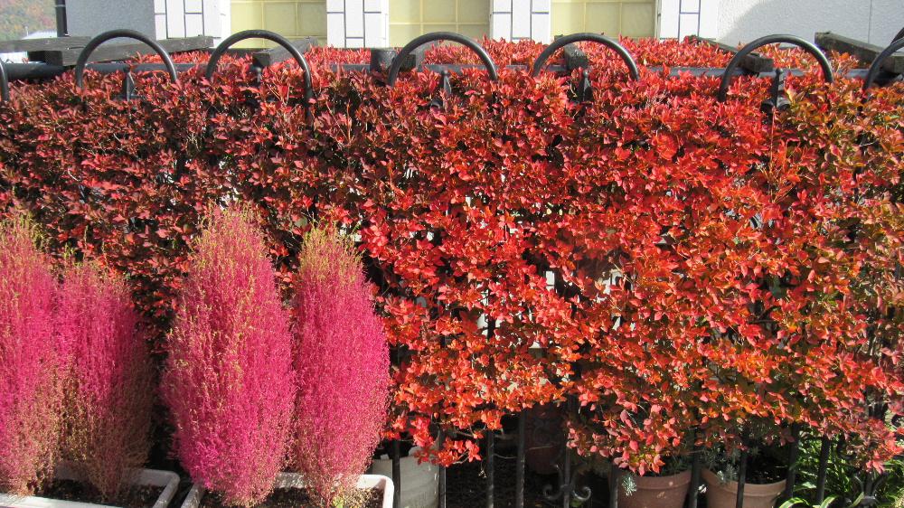 深い霧が一面に風景を薄墨のように覆っています 昼近くになると霧も晴れようやく周りの秋の風景になります 玄関前の「ドウタン」と「コキア」がようやく色づいてきました でも夕焼けにはまだかなわないかなあ 真っ赤になるまでもう少しです