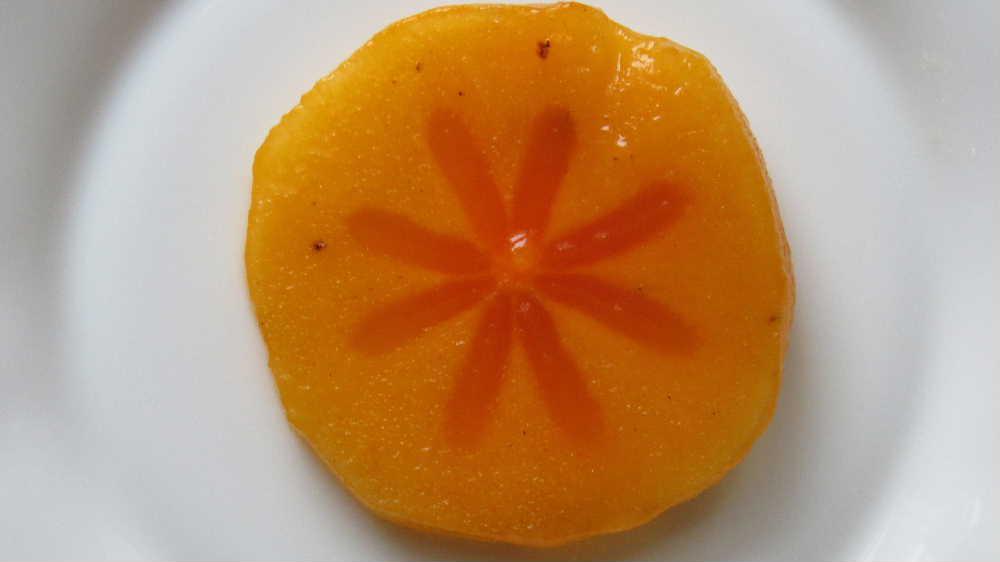 これは何の花? 今年最後のカキを近所の方からいただいたので皮を向いて輪切りにしてみました 白い皿にもった模様にいつも食べているカキとは思えない花柄模様を浮き上がらせています 熊騒ぎで話題となった果物の一つで熊の餌となっているカキの木が数多くk切り倒されたとのニュースも流れた一年でした