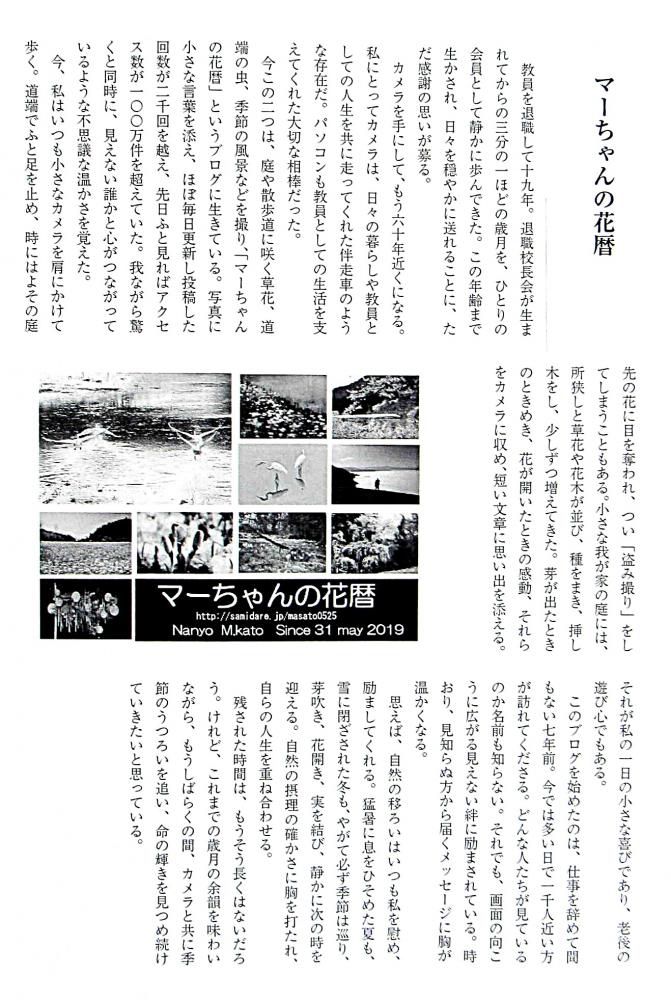 私が所属している団体が今年度60周年を迎えました 会員一人ひとりに原稿の依頼があり「マーちゃんの花暦」と題する一文を寄せました 会員の皆さんにはあまり興味のある題ではないかもしれませんがブログへの思いを認めました 高齢老人の暇つぶしでしかありませんがブログに訪問しお付き合いしてくださっている方へのメッセージを込めて原稿を作りました 投稿者マーちゃんの思いを感じとっていただけたらうれしいです