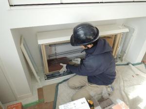まずは、フェンスの柱をモルタルで固定していきます。外部では外壁のコーキングやさんが乗り込みです。外壁のジョイント部、アルミサッシ廻り、ベンドキャップ廻りに外壁同色のシーリング材を打っていきます。