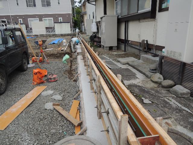 当現場では、土留めコンクリートの上にフェンスが建つため、ボイド管をいれてからコンクリートを打設し、コンクリートに穴が開くように施工します。