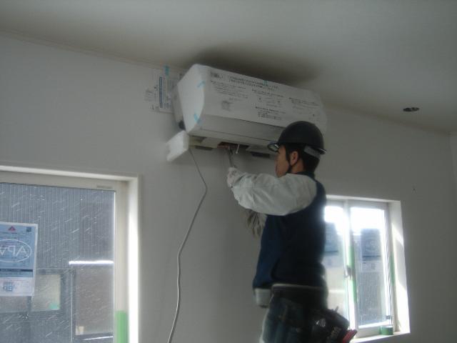 壁・天井のクロス貼りが完了し、エアコン・照明器具等々の器具付け開始です。